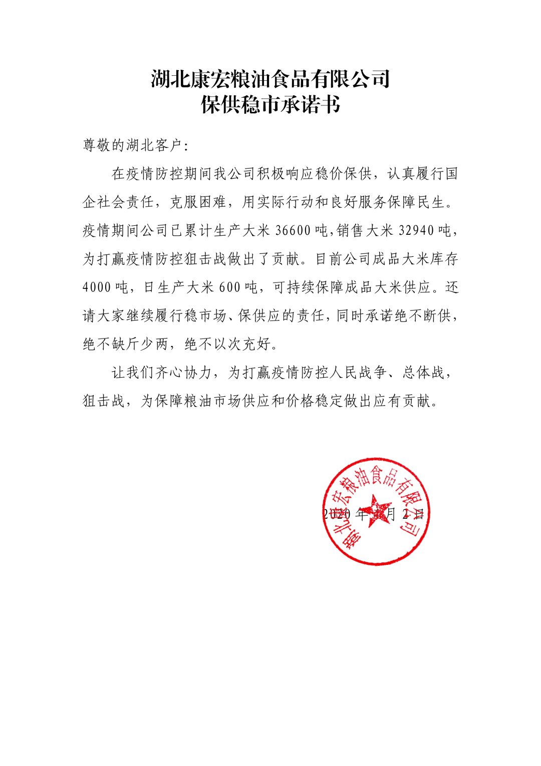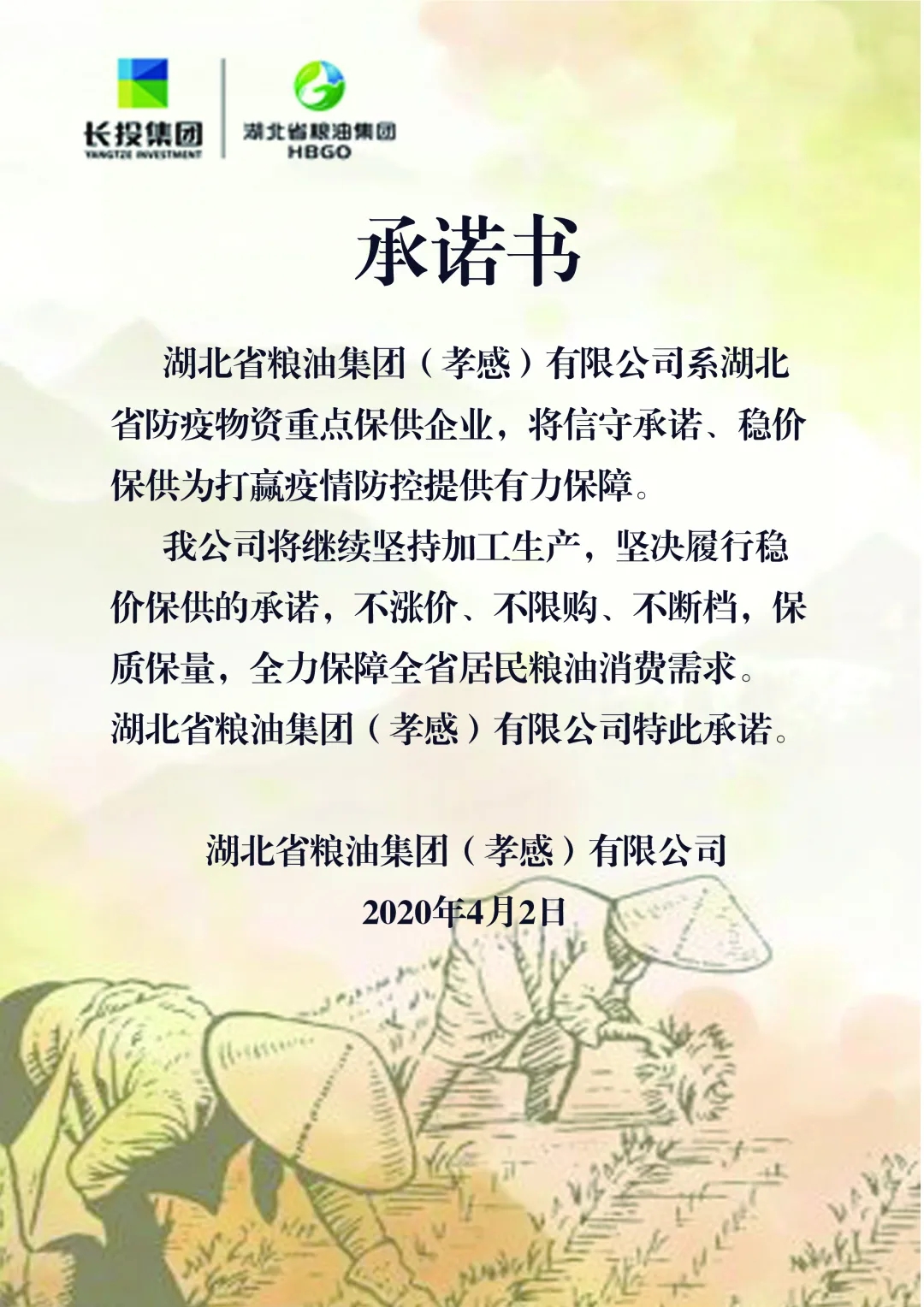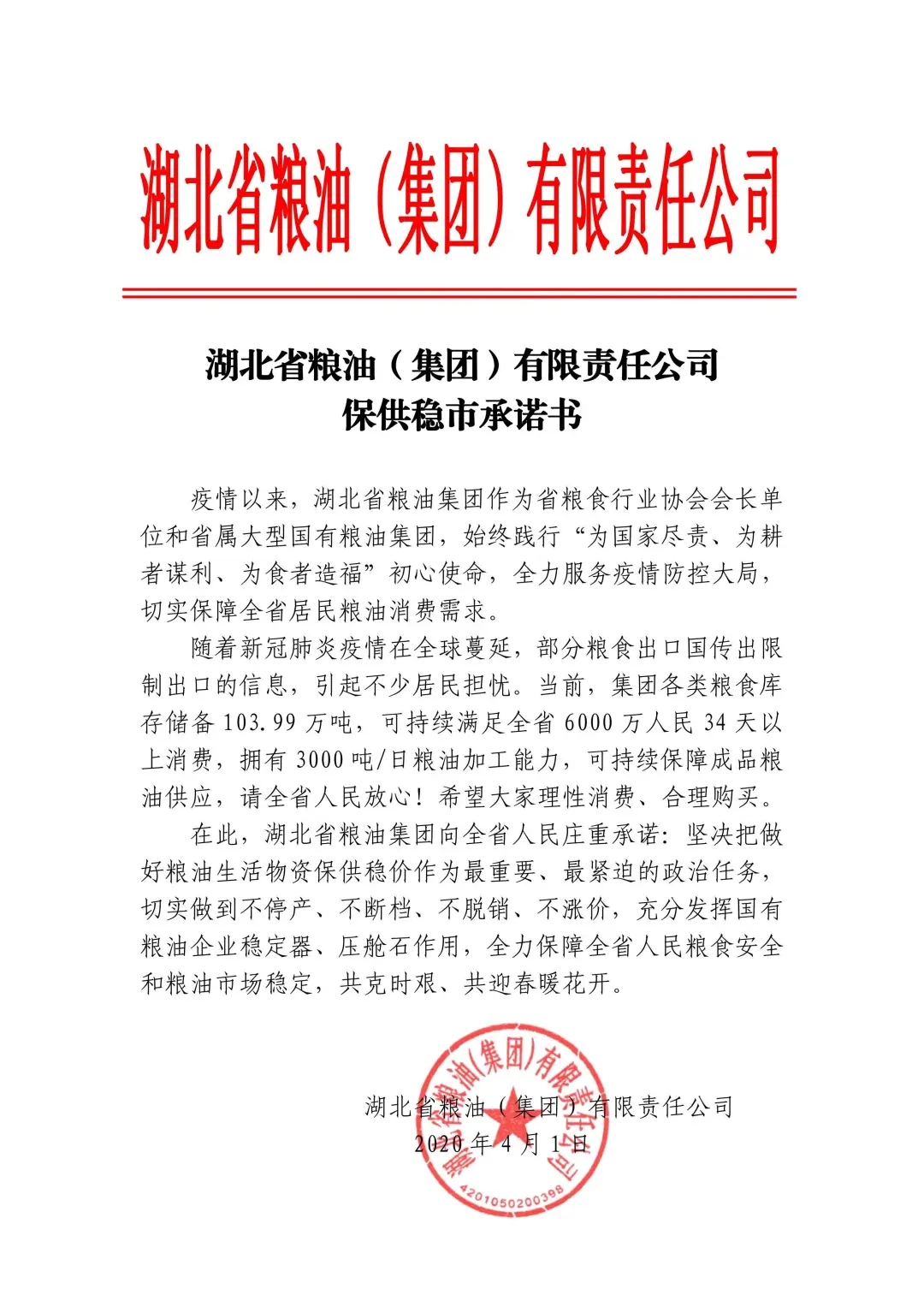 圖:湖北省糧油集團保供穩市承諾書