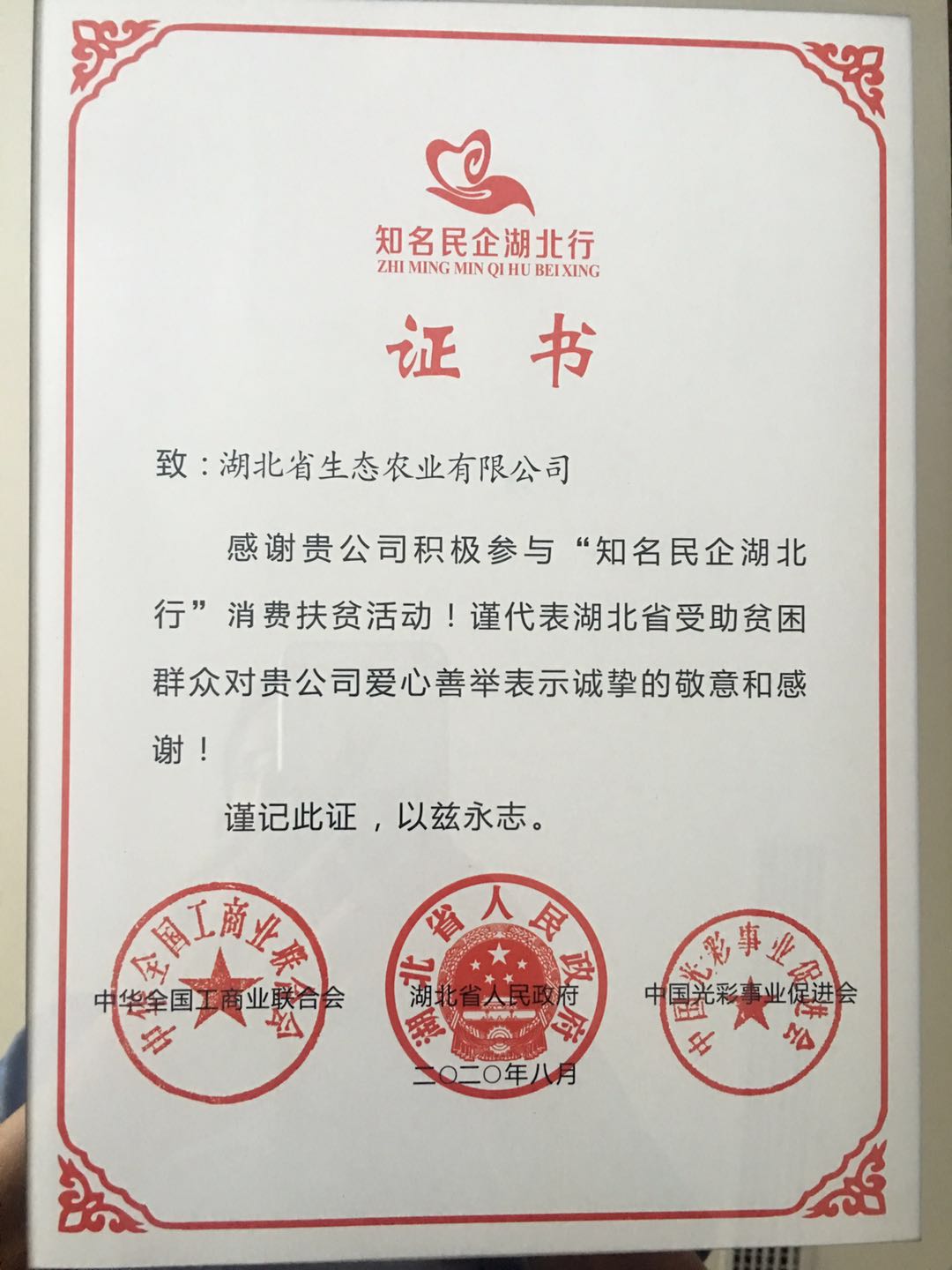 近日,湖北省生態農業有限公司榮獲中華全國工商業聯合會、湖北省人民政府、中國光彩事業促進會聯合頒發的“知名民企湖北行”榮譽證書。