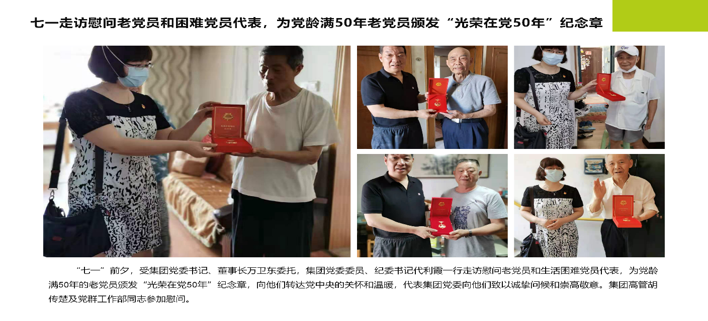 “七一”前夕,受集團黨委書記、董事長萬衛東委托,集團黨委委員、紀委書記代利霞一行走訪慰問老黨員和生活困難黨員代表,為黨齡滿50年的老黨員頒發“光榮在黨50年”紀念章,向他們轉達黨中央的關懷和溫暖,代表集團黨委向他們致以誠摯問候和崇高敬意。集團高管胡傳楚及黨群工作部同志參加慰問。