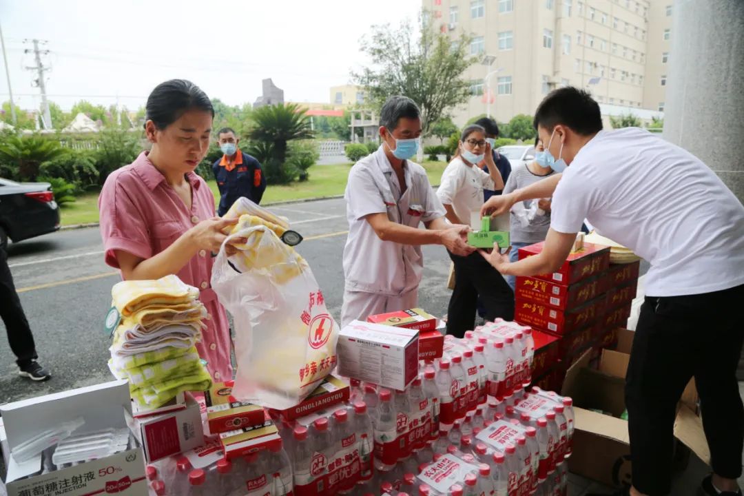 圖:集團工會副主席、九星公司黨支部書記、董事長張偉洪,九星公司總經理李智勇為一線員工送去毛巾、綠豆、風油精等降溫防暑用品。慰問活動中,九星公司安委會還對車間倉庫等環節安全生產措施落實情況進行再檢查。