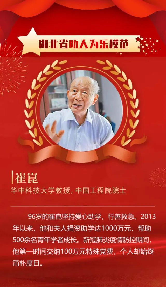 事跡簡介:96歲的崔崑堅持愛心助學,行善救急。2013年以來,他和夫人捐資助學達1000萬元,幫助500余名青年學者成長。新冠肺炎疫情防控期間,他第一時間交納100萬元特殊黨費,個人卻始終簡樸度日。