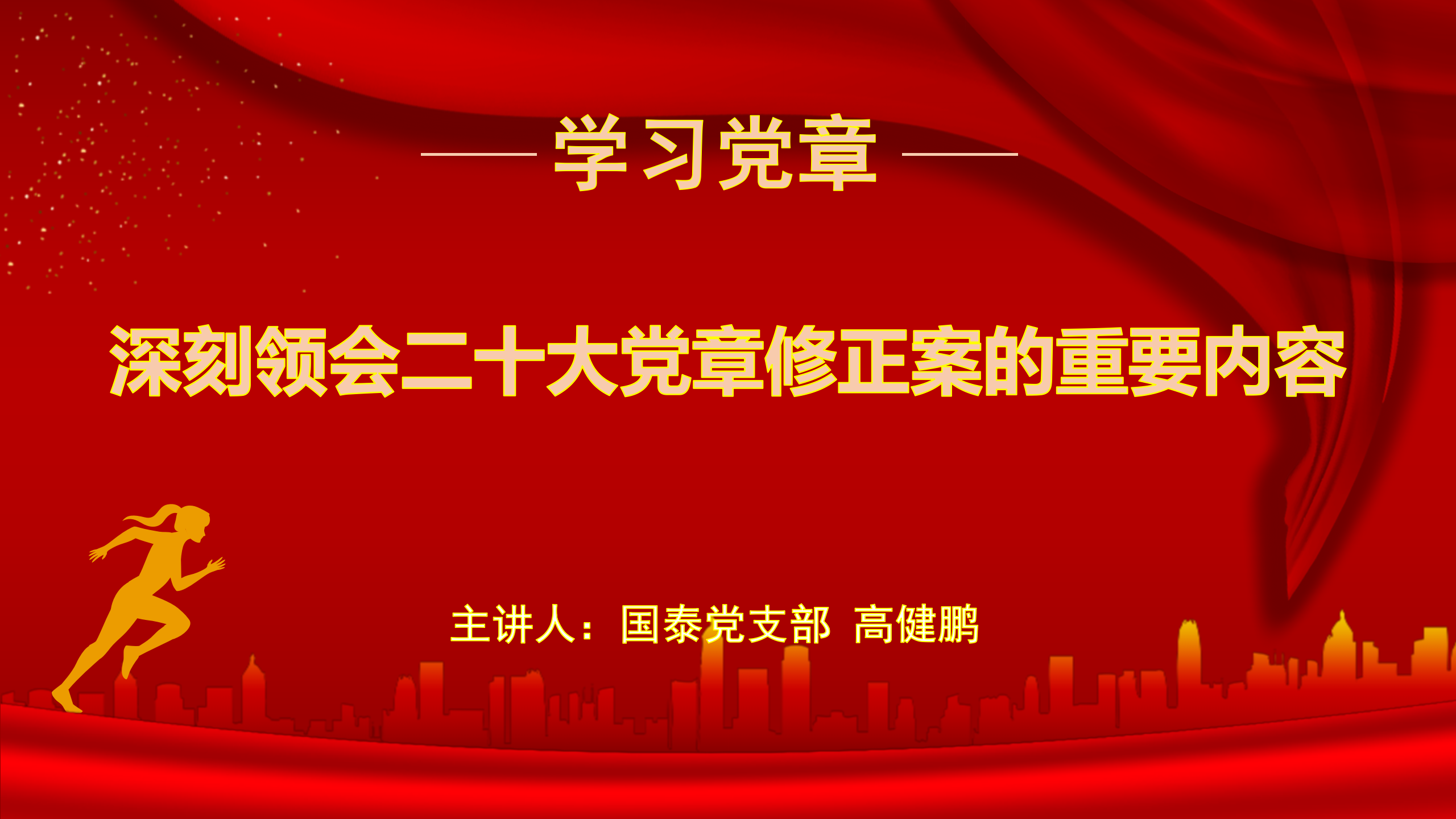 國泰黨支部書記高健鵬帶領全體黨員集體學習了二十大黨章修正案的重要內容。本次黨章修正,充實完善習近平新時代中國特色社會主義思想的科學內涵和歷史定位,把“兩個結合”這一馬克思主義中國化時代化的規律性認識寫入黨章,把黨百年奮斗的重大成就和歷史經驗寫入黨章,對關于社會主義初級階段的相關內容進行了調整和充實,增寫了堅持和加強黨的全面領導的有關內容,吸收黨的十九大以來全面從嚴治黨的寶貴經驗,對黨的建設相關內容進行了調整充實。高健鵬還就學習內容與現場黨員進行了問答互動。