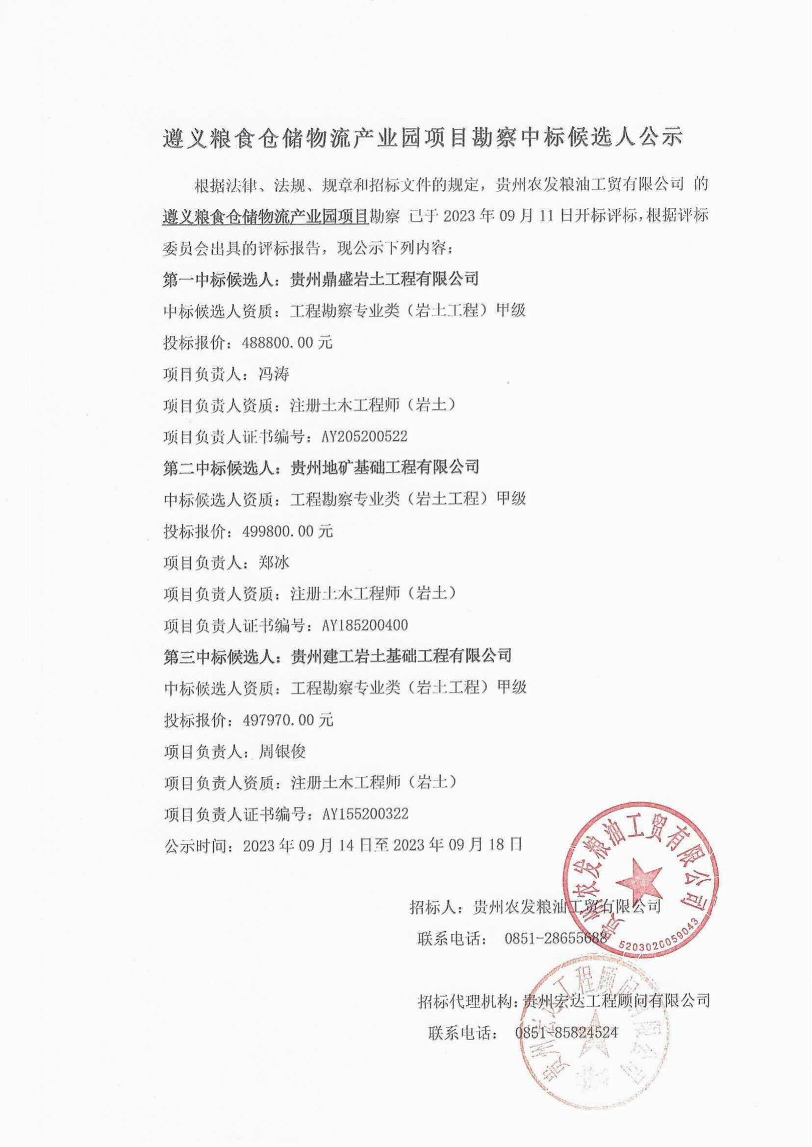 遵義糧食倉儲物流產業園項目勘察中標候選人公示