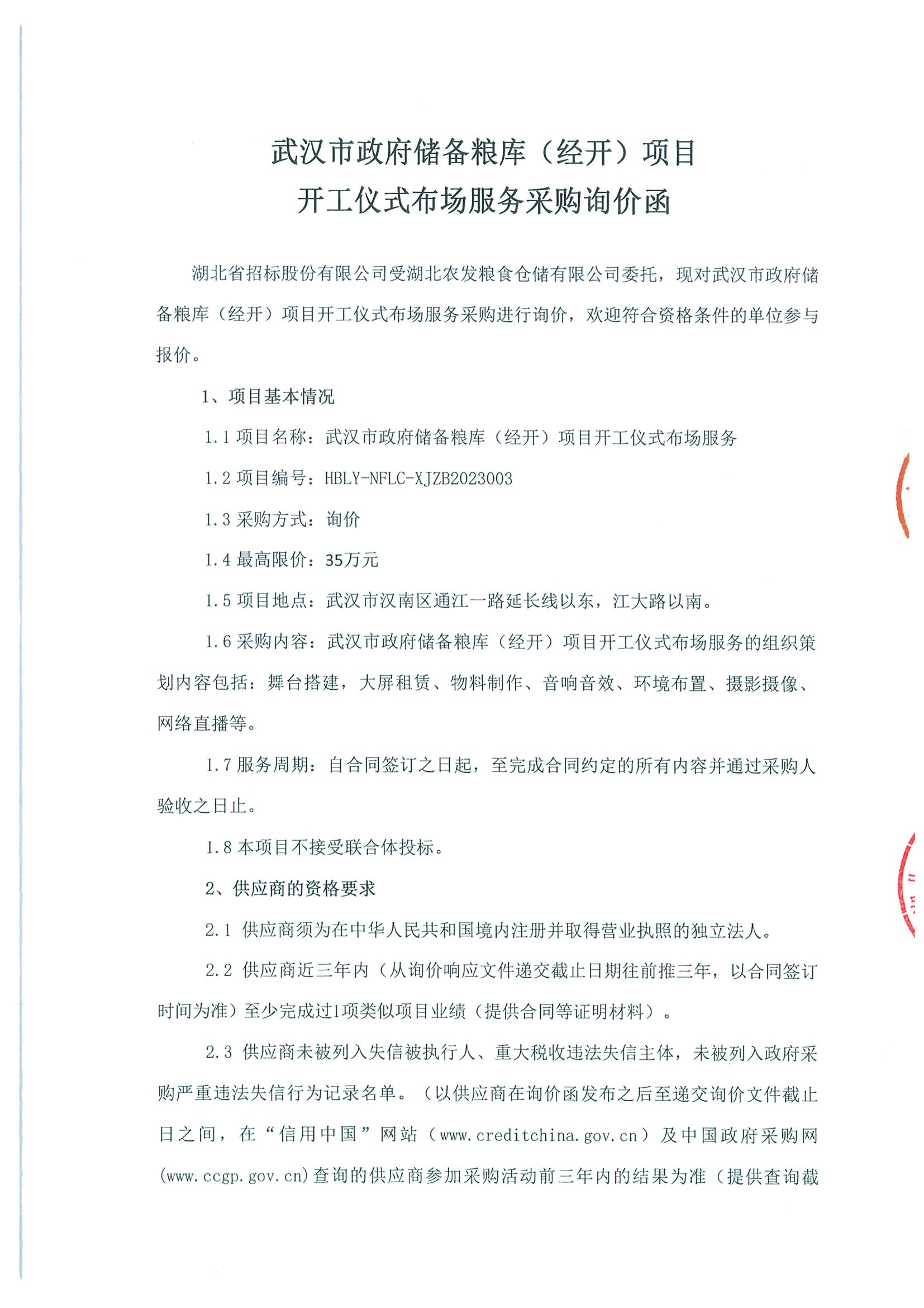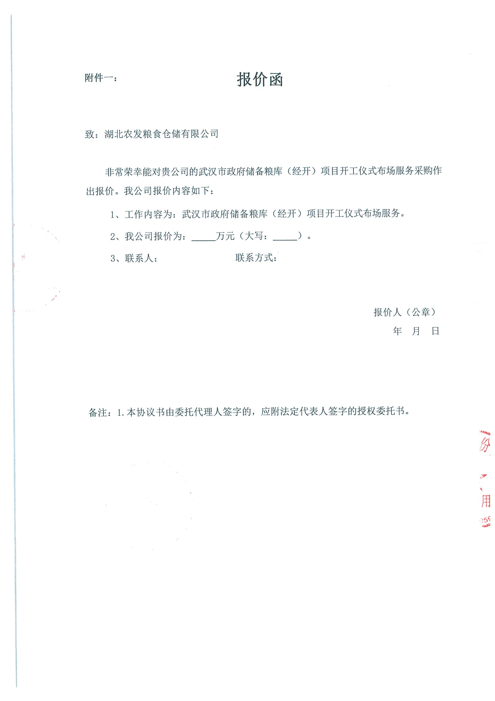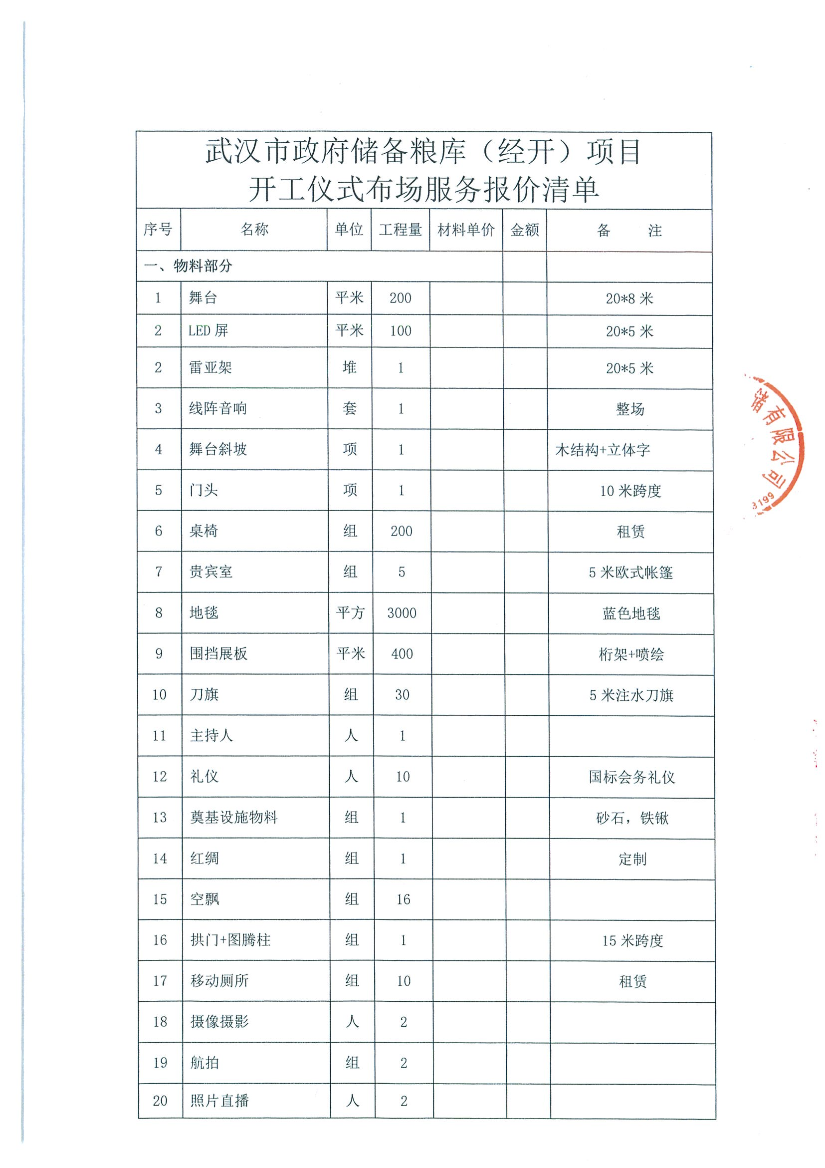 武漢市政府儲備糧庫(經開)項目開工儀式布場服務采購詢價函