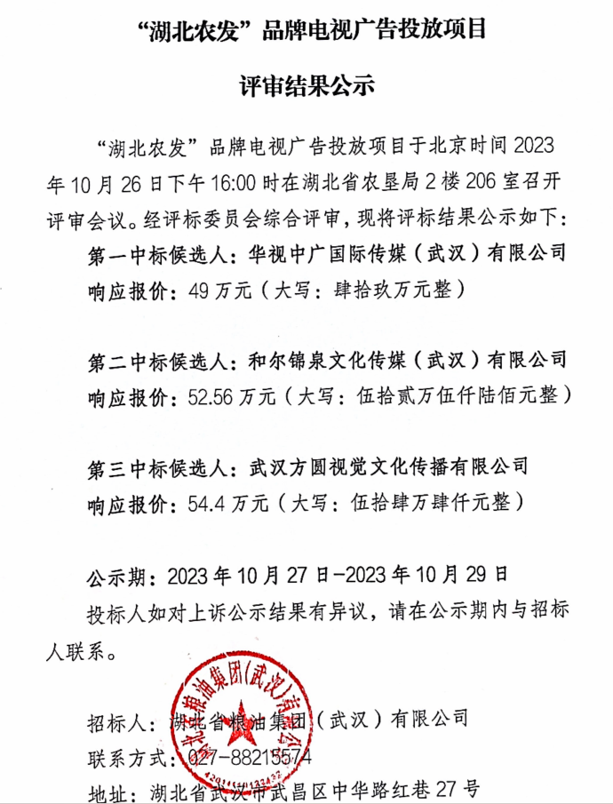 “湖北農發”品牌電視廣告投放項目評審結果公示