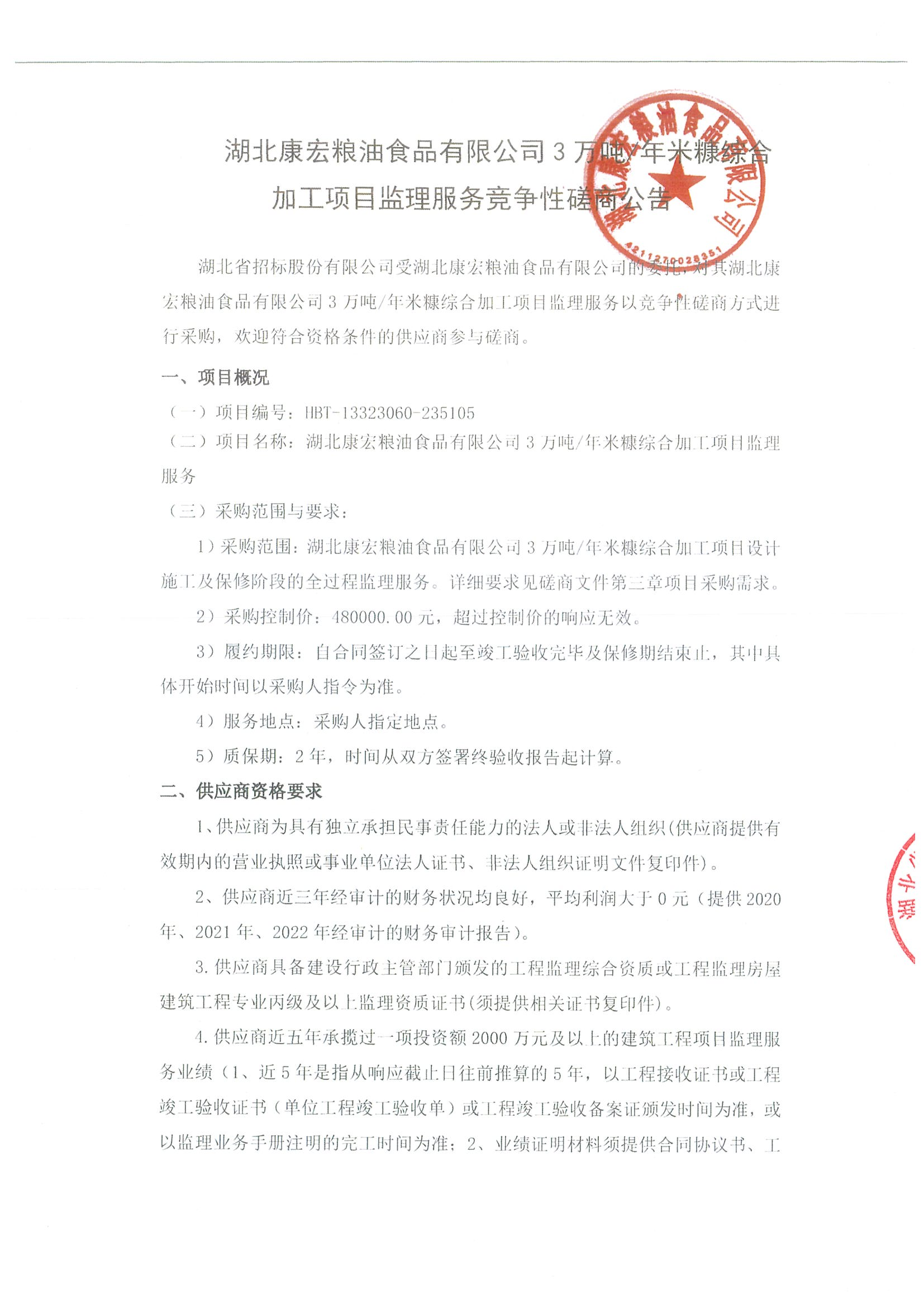 湖北康宏糧油食品有限公司3萬噸/年米糠綜合加工項目監理服務競爭性磋商公告