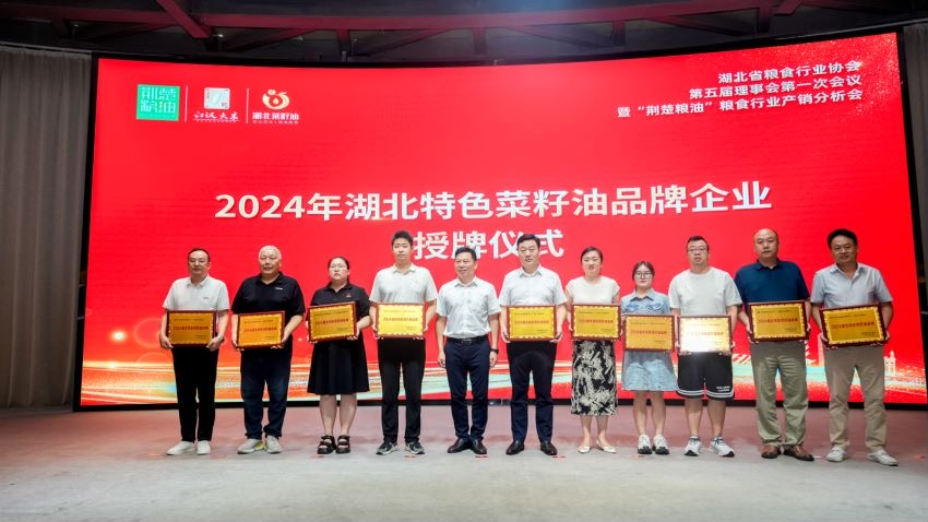 在同期舉辦的協會第五屆理事會第一次會議暨“荊楚糧油”糧食行業產銷分析會上,全票通過了協會黨委、支部換屆工作方案、協會秘書處副秘書長提名人選、分支機構設置情況以及協會秘書處“三重一大”事項,同時向入選第十二批全省放心糧油示范企業和2024湖北特色菜籽油品牌企業代表頒授獎牌。