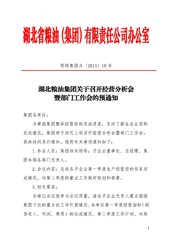 湖北糧油集團(tuán)關(guān)于召開經(jīng)營(yíng)分析會(huì)暨部門工作會(huì)的預(yù)通知