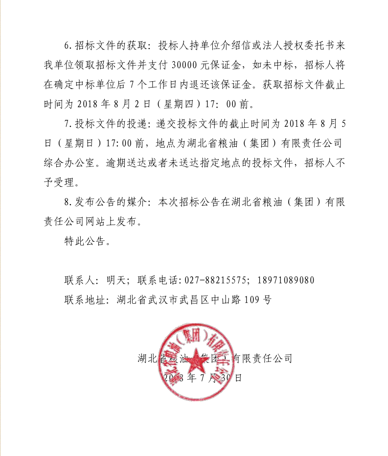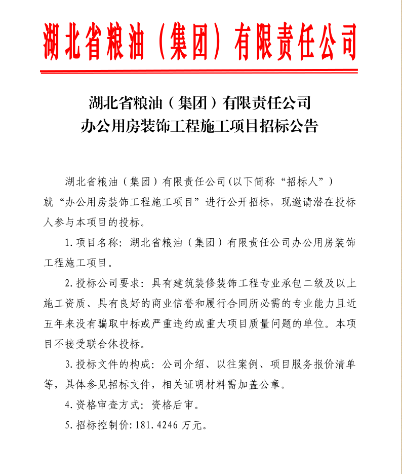 湖北省糧油(集團)有限責任公司辦公用房裝飾工程施工項目招標公告