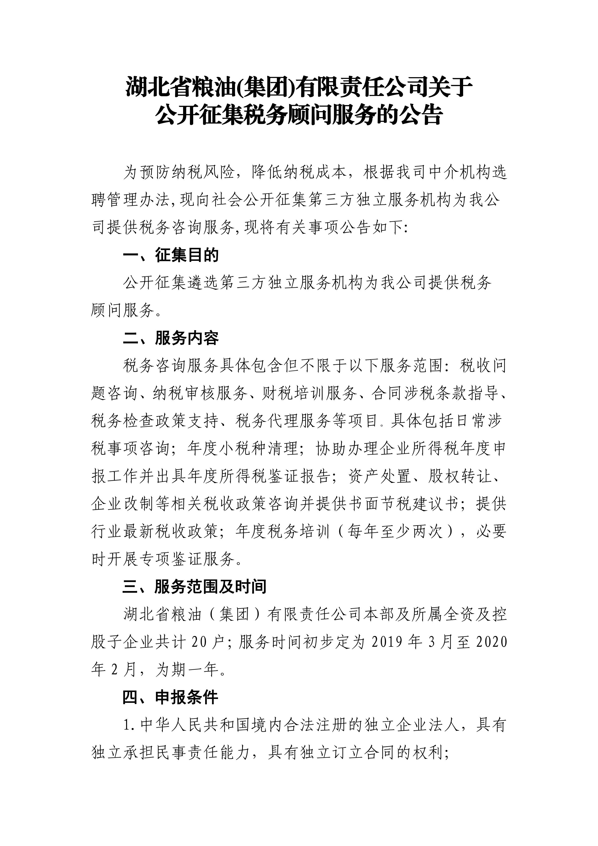 為預防納稅風險,降低納稅成本,根據我司中介機構選聘管理辦法,現向社會公開征集第三方獨立服務機構為我公司提供稅務咨詢服務,現將有關事項公告如下: