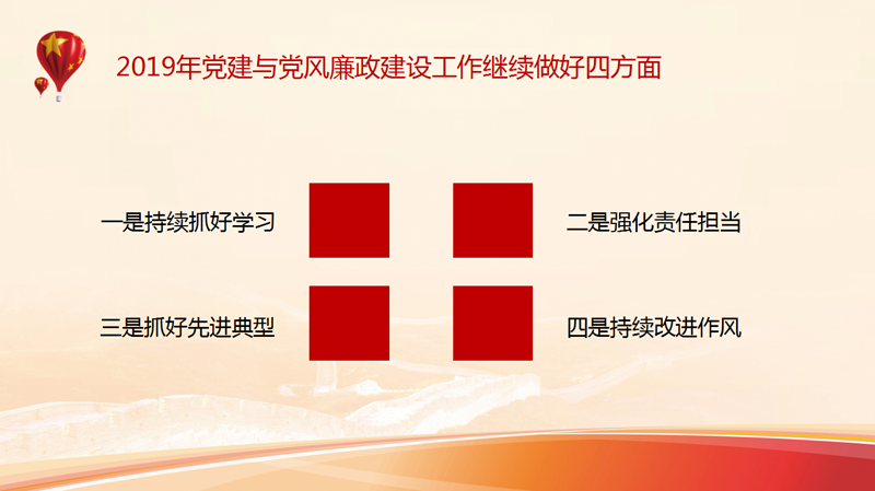 最后,萬衛(wèi)東同志總結(jié)強調(diào),各級黨組織必須堅決貫徹全面從嚴(yán)治黨要求,持之以恒推進懲治和預(yù)防腐敗體系建設(shè)。并對公司2019年黨建和黨風(fēng)廉政建設(shè)工作提出四點要求:一是增強政治自覺。馳而不息抓好基層黨建和黨風(fēng)廉政建設(shè)工作,堅持思想引領(lǐng),以紅色引擎促進改革發(fā)展;二是堅持問題導(dǎo)向。重點抓好對關(guān)鍵人、關(guān)鍵環(huán)節(jié)的督查指導(dǎo),為生產(chǎn)經(jīng)營工作穩(wěn)定開展保駕護航;三是創(chuàng)新工作方法。進一步豐富黨委中心組學(xué)習(xí)和支部主題黨日活動的學(xué)習(xí)內(nèi)容,創(chuàng)新活動形式,增強學(xué)習(xí)效果;四是加快品牌建設(shè)。積極挖掘混合所有制企業(yè)開展黨建工作的經(jīng)驗,形成自身特色和亮點,豐富公司品牌文化。