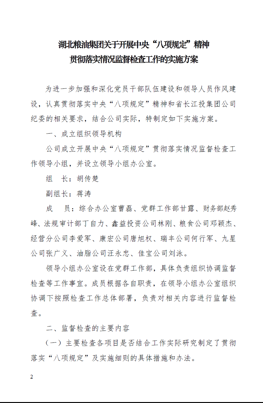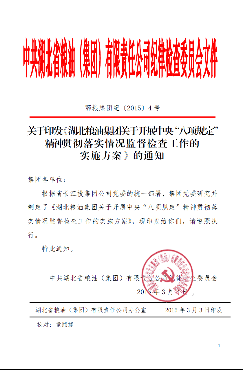 關于印發(fā) 《湖北糧油集團關于開展中央 “八項規(guī)定”精神貫徹落實情況監(jiān)督檢查工作的實施方案》的通知